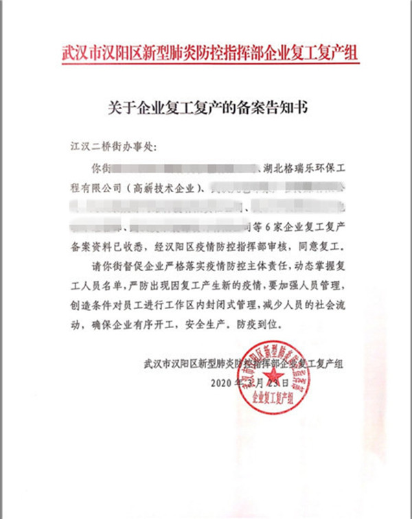 今天,湖北格瑞樂環(huán)保正式復(fù)工啦!
